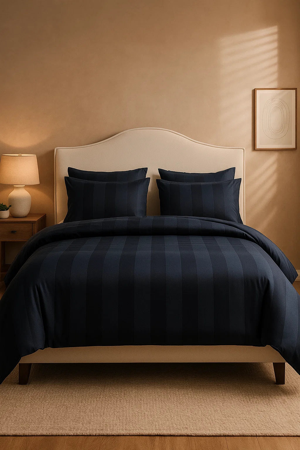 Our 400 thread count cotton sateen Classic Navy Blue Duvet Cover Set - Neutral Minimalist Bedding. Crafted from the finest long-staple cotton, these sheets are exceptionally soft, smooth, and breathable. Enjoy a restful night's sleep on our luxurious bedding, expertly woven for durability and lasting softness. Each set includes a Duvet Cover and two matching pillowcases. Available in a wide range of solid colors to complement any bedroom decor. Experience the difference of true luxury.