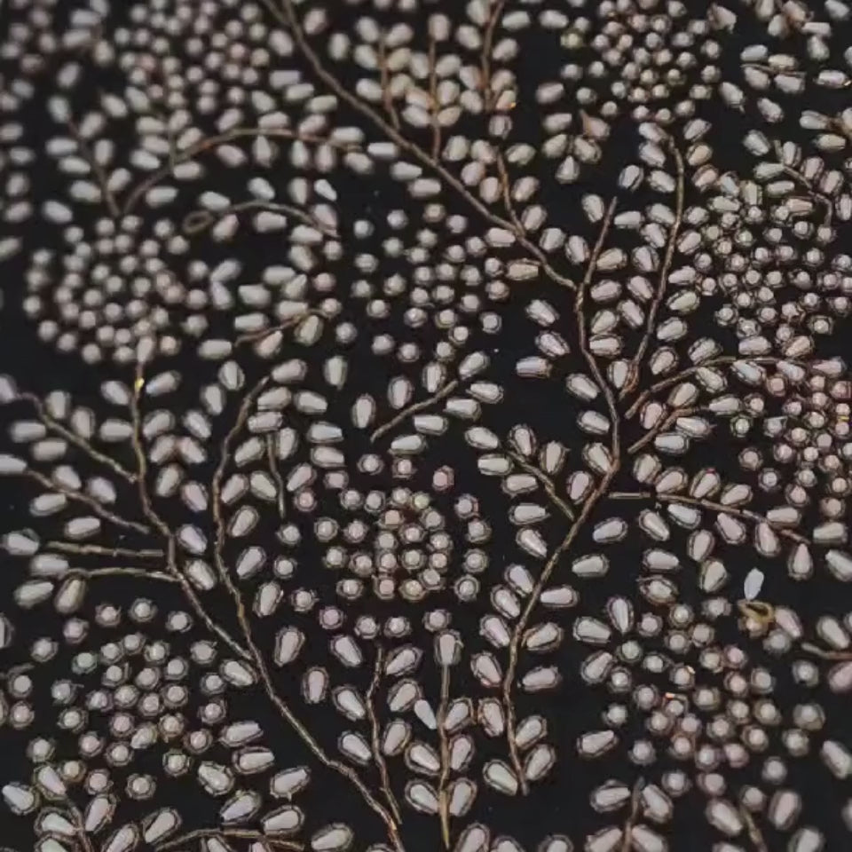 This beautiful Table Runner Set is not just decor, it’s a piece of art. Crafted on rich black velvet, it features complicated hand embroidery with delicate pearls and silver beads, forming a floral pattern that lives slightly as it catches the light.