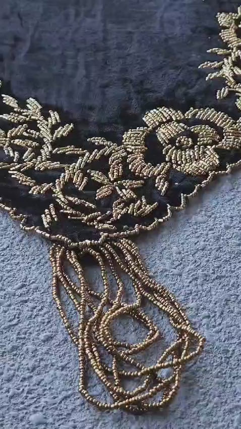 This beautiful Table Runner Set is not just decor, it’s a piece of art. Crafted on rich black velvet, it features complicated hand embroidery with delicate golden beads, forming a floral pattern that lives slightly as it catches the light.