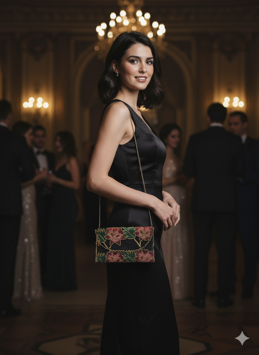 Women Black Floral Clutch Embellished Beaded (Design-I)